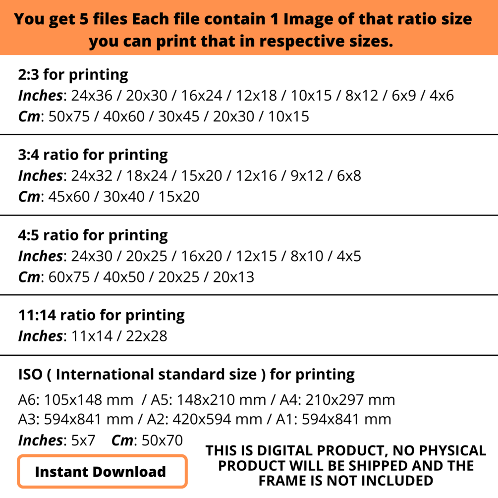 All files are high-resolution JPEG at 300 dpi to make sure your print looks amazing! You’ll receive the art print image in 5 different size ratios so your artwork will fit in almost any frame. See the 'Included Sizes' on the listing for a detailed guide.